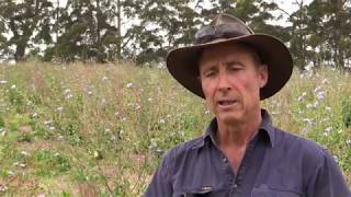 The Ryans compared a new mix of different species to usual practice (oats, rye and clover) to see what would grow really well over autumn/winter and survive through summer and autumn. The new mix was seeded in February 2014 and irrigated to get it going. Initially purslane was a dominant species in the more disturbed areas where the irrigator turned around but it was soon outcompeted.